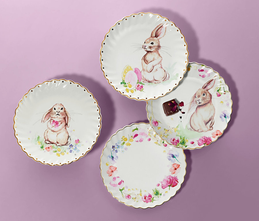 Talerzyki deserowe wykonane są z wysokogatunkowej porcelany i ozdobione różnymi akwarelowymi wzorami, które wyglądają jak ręcznie malowane. Złote motywy nadają im delikatnego, świątecznego charakteru, dlatego idealnie nadają się na małe słodkości, np. praliny, ciasta albo po prostu jako wiosenna dekoracja.