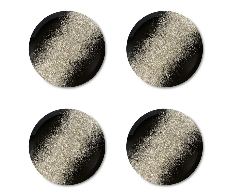 Jeśli chcesz zapobiec pojawianiu się nieatrakcyjnych odcisków szklanek i plam z wody na stole, te cztery szklane podkładki będą dla Ciebie idealnym rozwiązaniem. Wykonane z ciemnego filcu - w celu ochrony delikatnych powierzchni - oraz szkła o złotym połysku, będą ozdobą każdego stołu. Ozdobne okrągłe podkładki mają średnicę dziesięciu centymetrów.