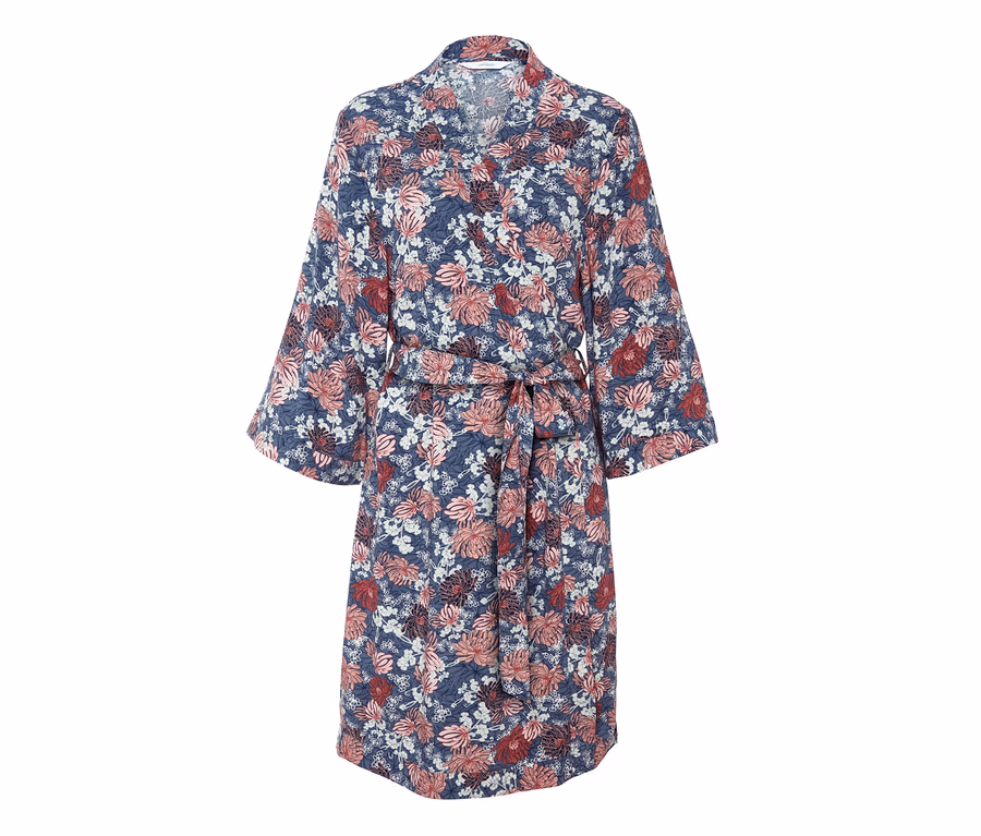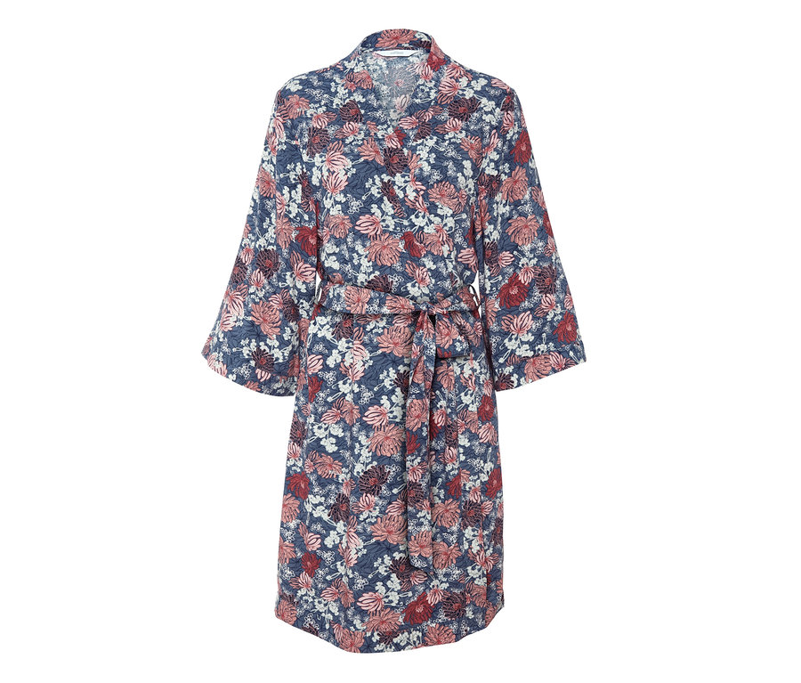 Damski szlafrok w klasycznym, kimonowym stylu to idealne ubranie na cudowne chwile relaksu i rozpoczęcie dnia z miłym uczuciem na skórze. Kimono wykonane jest z tkanej wiskozy, która miękko układa się na ciele. Szlafrok oprócz klasycznego paska do wiązania ma również wewnętrzne troczki do regulacji obwodu. Wzór w kwiaty nadaje mu lekko romantycznego charakteru.