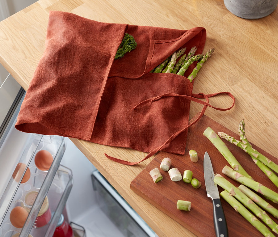 - Lekko zwilżyć ściereczkę i wypełnić kieszenie warzywami i ziołami, złożyć górną krawędź, zwinąć, zawiązać i przechowywać w lodówce