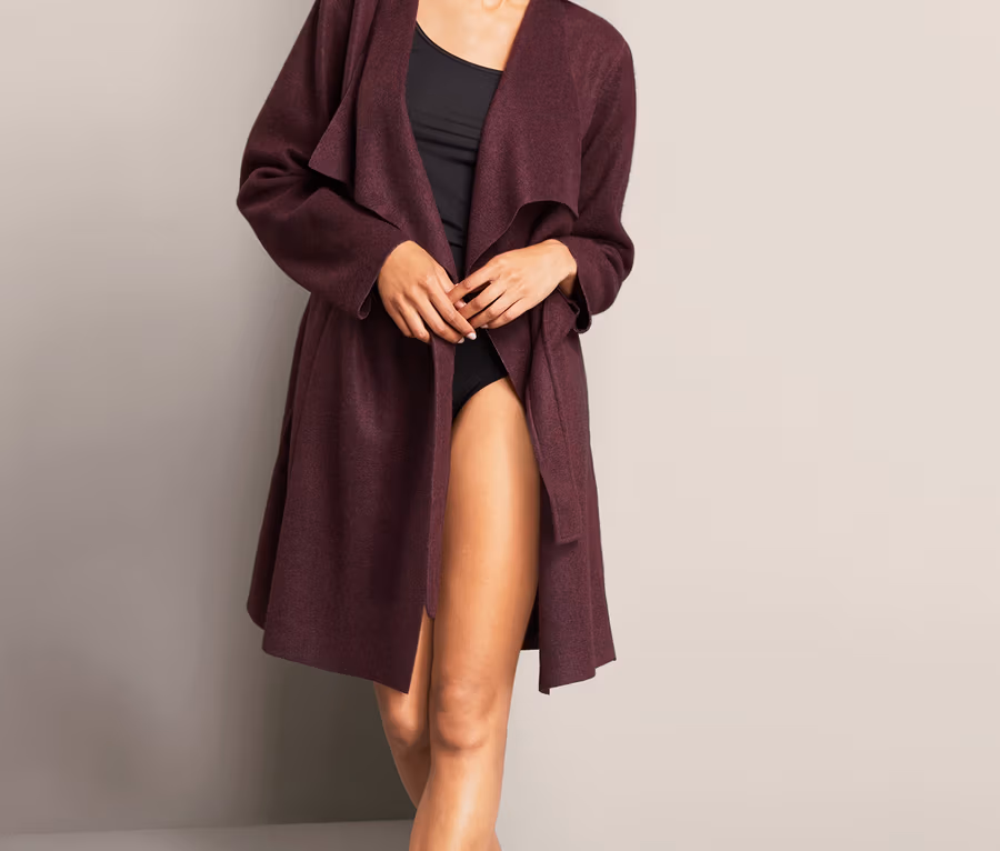 Kardigan o długości do kolan wykonany jest z miękkiego, ciepłego polaru z zawartością wiskozy. To sprawia, że doskonale nadaje się na chwile relaksu w domowym zaciszu, zwłaszcza gdy na dworze znów zagościła jesień. Dzięki paskowi można go związać w talii, a szeroki szalowy kołnierz podkreśla jego swobodny wygląd.