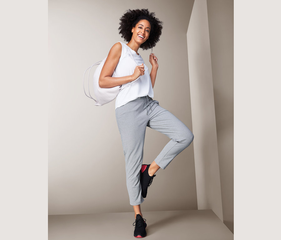 Damskie spodnie sportowe z materiałem z recyklingu sprawdzą się podczas dowolnego treningu. Dzięki powłoce DryActive Plus przepuszczają powietrze, odprowadzają wilgoć z powierzchni ciała i szybko schną. Dodatek elastanu sprawia, że są odporne na deformacje i idealnie leżą, zapewniając pełną swobodę ruchu. W dwóch wpuszczanych kieszeniach po bokach znajdzie się miejsce na drobiazgi, np. klucze. Damskie spodnie treningowe mają troczki do wiązania w pasie i zwężane nogawki, co nadaje im casualowego charakteru.
