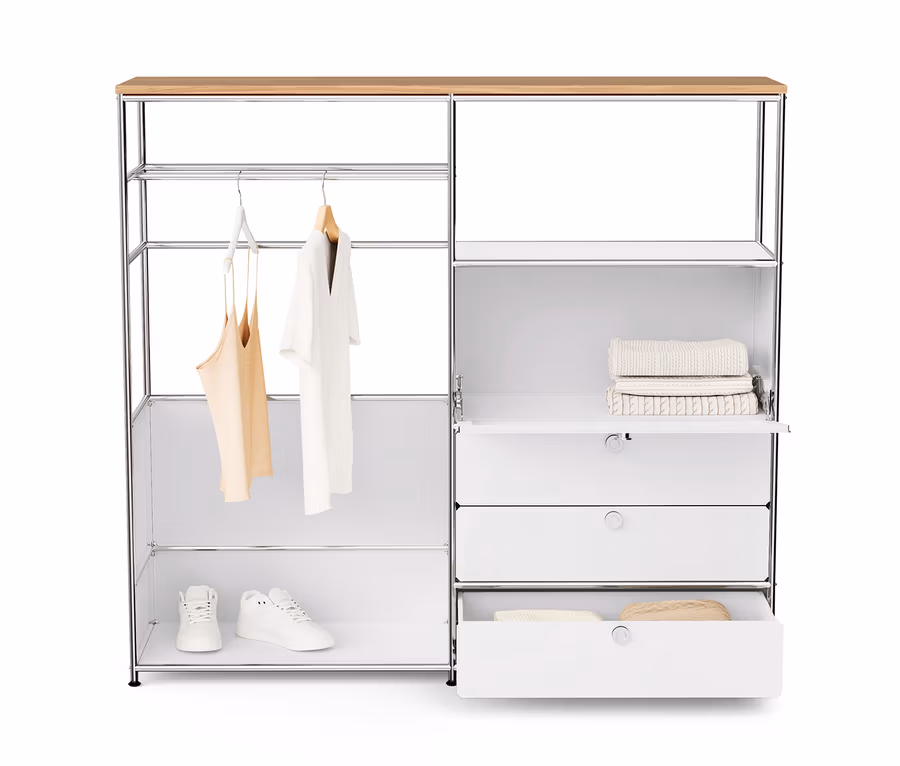 Metalowa komoda „CN3” z drewnianym blatem, 1 drążkiem na ubrania, 1 klapą i 3 szufladami, biała