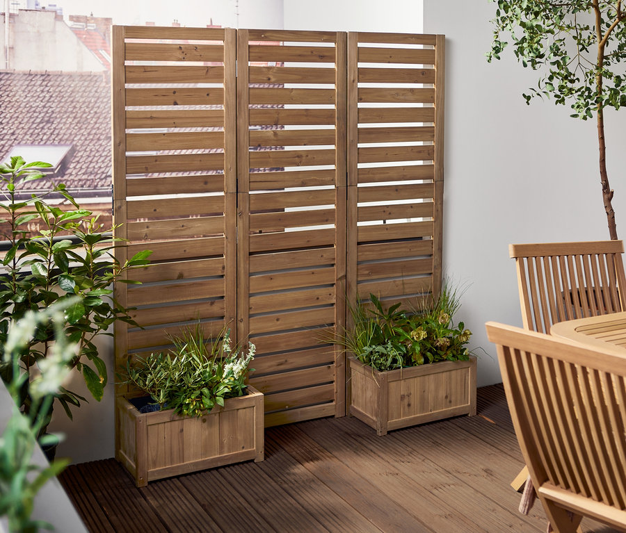 - W zestawie 3 połączone ścianki, 2 skrzynki na kwiaty wyłożone perforowaną folią, mocowanie do ściany, materiały montażowe i instrukcja montażu