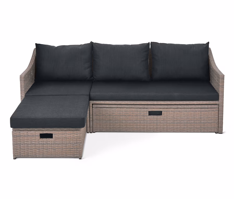 - Uniwersalne możliwości rozstawienia: jako sofa 3-osobowa, narożnik lub sofa rozsuwana - do ogrodu lub na taras