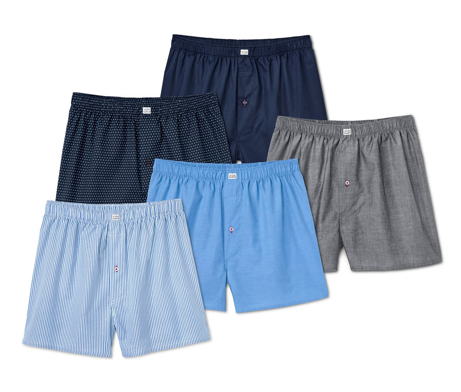 - 1x błękitny wzór Chambray, 1x granatowy wzór Chambray, 1x błękitno-białe w paski, 1x granatowe, 1x granatowe z białym nadrukiem na całej powierzchni