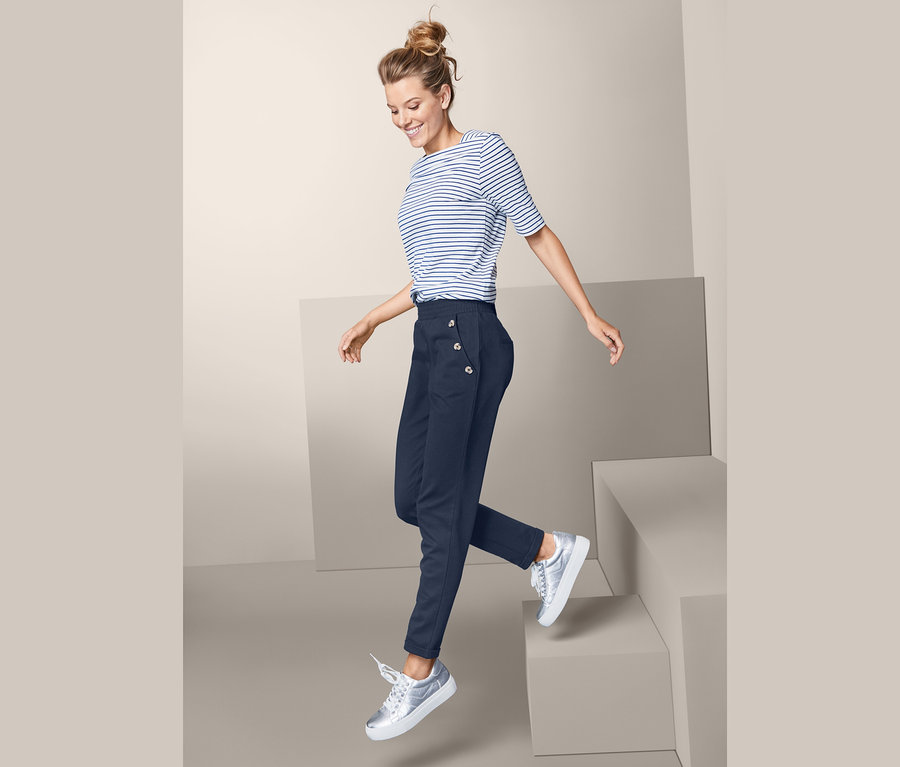 Damskie spodnie z dzianiny dresowej o długości do kostek zachwycają ponadczasowym, niebieskim kolorem i lekko marynarskim stylem, który pasuje do każdej stylizacji. Miękka i elastyczna dzianina interlock oraz bawełna ekologiczna sprawiają, że spodnie są zawsze przyjemne w dotyku. Domieszka elastanu gwarantuje natomiast, że są odporne na deformacje i zapewniają wysoki komfort noszenia.