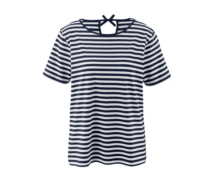 W koszulce w stylu marynistycznym nawet ciepły, letni dzień będzie nieco przyjemniejszy - tak jak w przypadku tej luźnej koszulki z krótkim rękawem. Dzięki zawartości bawełny koszulka damska przyjemnie miękko otula skórę, a elastan zapewnia zachowanie kształtu i wysoki komfort noszenia przy doskonałym dopasowaniu. Koszulka ma okrągły dekolt i małe wycięcie w serek oraz ozdobne kokardki na plecach.