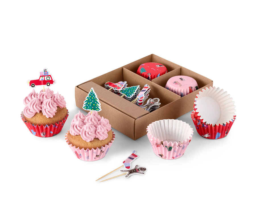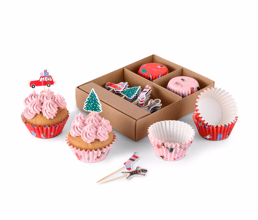 - Z 24 foremkami na muffiny, 24 dekoracjami oraz ozdobnym pudełkiem
