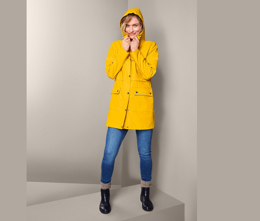 Serdeczne pozdrowienia z wybrzeża! Damska parka przeciwdeszczowa w żółtym kolorze z podszewką wewnętrzną w paski nie przypadkowo przypomina klasyczne sztormiaki: bez problemu sprawdzi się w surowym, nadmorskim klimacie. Swoje wiatroszczelne i nieprzemakalne właściwości damska parka zawdzięcza dwuwarstwowemu laminatowi i klejonym szwom, dzięki czemu materiał wierzchni wytrzymuje obciążenie słupa wody do 3000 mm.
