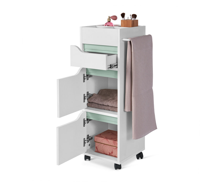 - Praktyczne miejsce do przechowywania na kółkach: z półkami, przegródkami i drążkiem na ręcznik