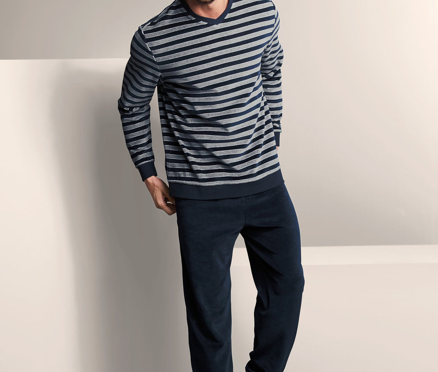 Tej wygodnej piżamy z weluru wcale nie chce się rano zdejmować. Miękka tkanina o wysokiej zawartości bawełny jest przyjemnie rozgrzewająca, a ściągacze na zakończeniu rękawów i nogawek zapewniają wysoki komfort noszenia. Spodnie piżamy wygodnie leżą dzięki elastycznemu wykończeniu w pasie, a pasiasta koszulka ma dekolt w serek.