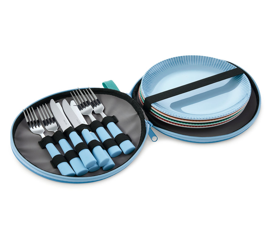 Mając pod ręką ten zestaw, w okamgnieniu przygotujemy piknik: w poręcznej torbie zapinanej na zamek błyskawiczny z uchwytem mieszczą się talerze i sztućce dla 4 osób, które sprawią, że jedzenie na świeżym powietrzu będzie smakowało o niebo lepiej. Torba posiada wewnętrzne przegródki, do których można włożyć naczynia. Posiada również wyściółkę, dzięki której jest łatwa do czyszczenia.