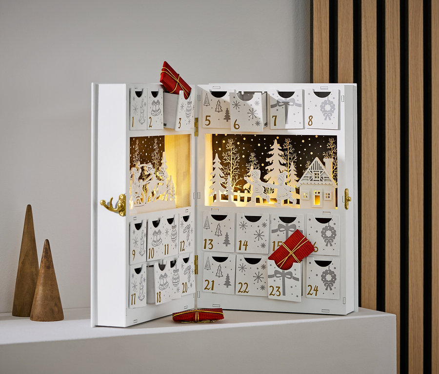 - Bogato zdobiony kalendarz adwentowy z nastrojowym oświetleniem