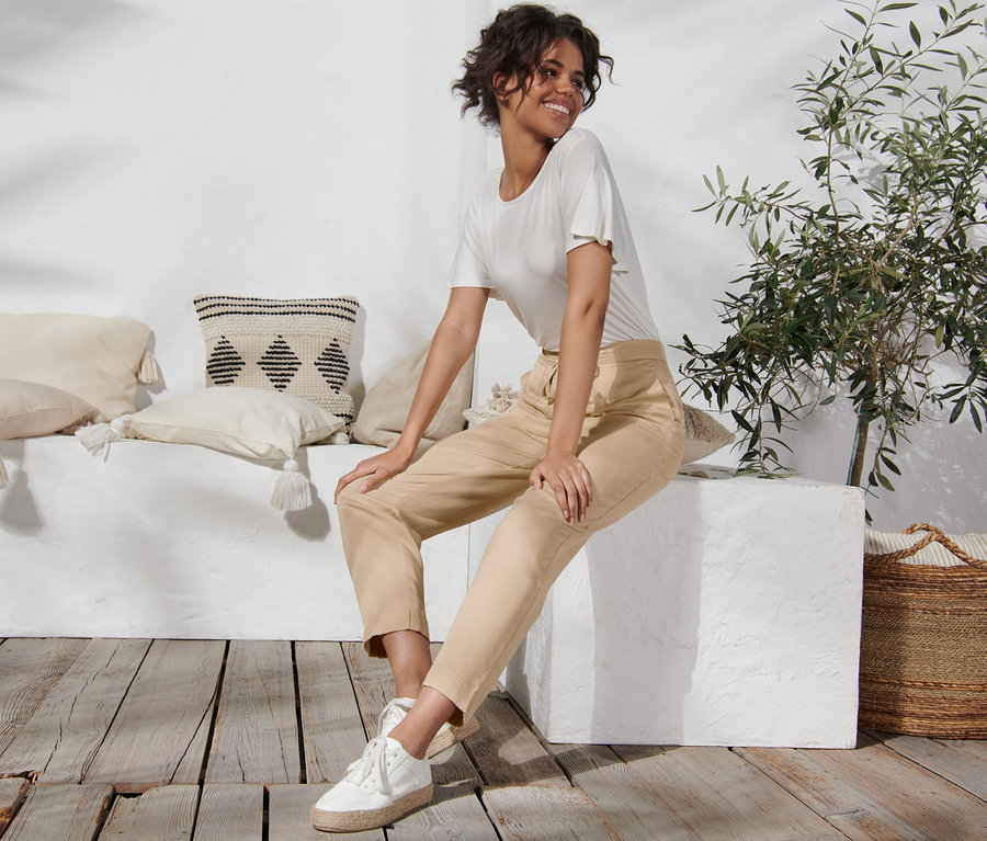 - Te spodnie zawierają włókna ze zrównoważonego drewna.