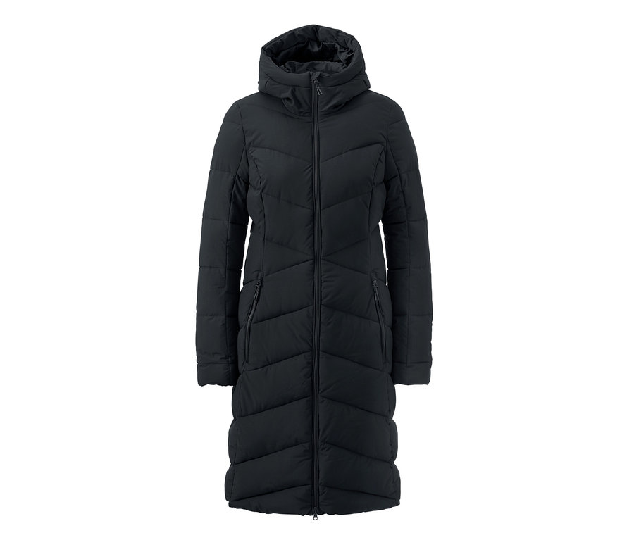 Wyjątkowo miękki, pikowany płaszcz damski z lekkim, ciepłym wypełnieniem wręcz zachęca do spaceru po pierwszym śniegu, ponieważ szczególnie przyjemna, miękka w dotyku tkanina jest wodoodporna dzięki przyjaznej dla środowiska impregnacji ecorepel®. Teraz można częściej decydować się na wyjście z domu - zwłaszcza gdy wiatr i chłód są powstrzymywane przez wysoko zapinany kołnierz i regulowany kaptur. Dwukierunkowy zamek błyskawiczny z ochroną podbródka doskonale zatrzymuje ciepło, a dopasowany krój i dłuższy fason płaszcza zimowego kształtują kobiecą sylwetkę. 2 kieszenie boczne zapinane na zamek błyskawiczny oferują miejsce na drobiazgi.