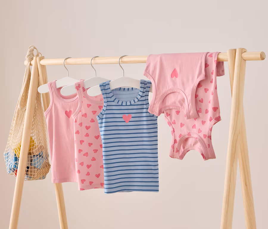 - 2x jasnoróżowy w różowe serduszka, 2x jasnoróżowy z różowym nadrukiem, 1x w niebieskie paski z różowym nadrukiem