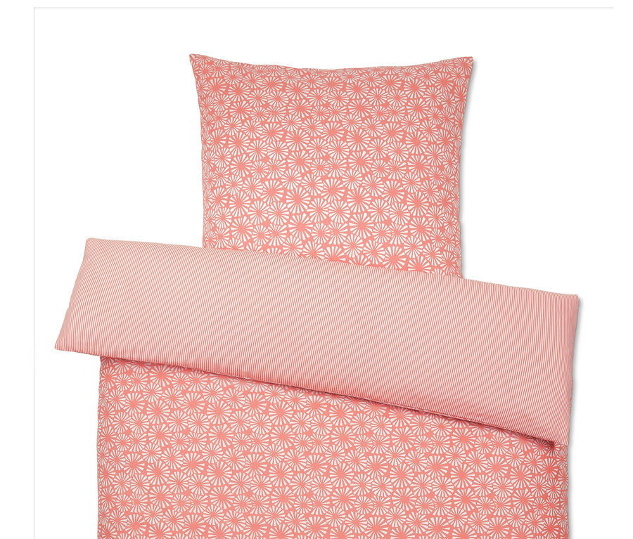 - 1x strona koralowa z białym wzorem na całej powierzchni, 1 strona koralowo-biała w paski