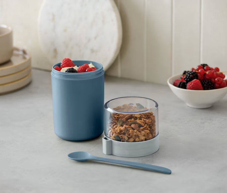 - Idealny do transportu np. jogurtu – pokrywka do oddzielnego przechowywania musli lub owoców