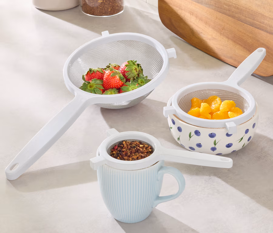 - Średnie i duże sitko kuchenne do mycia, odsączania i odcedzania warzyw, sałatek i owoców oraz do odcedzania ryżu lub makaronu