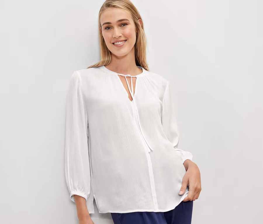 - Dekolt tunikowy z delikatnym marszczeniem i troczkami