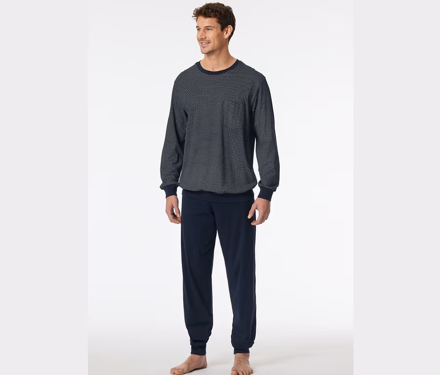 - Długa, granatowa piżama męska z wzorzystą górą