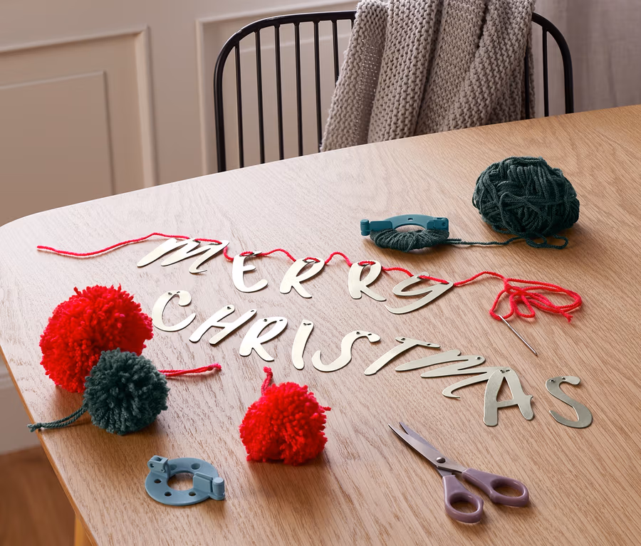 • Zestaw zawiera 2 narzędzia do robienia pomponów, 2 kłębki wełny, igłę i 14 literek do wykonania napisu Merry Christmas