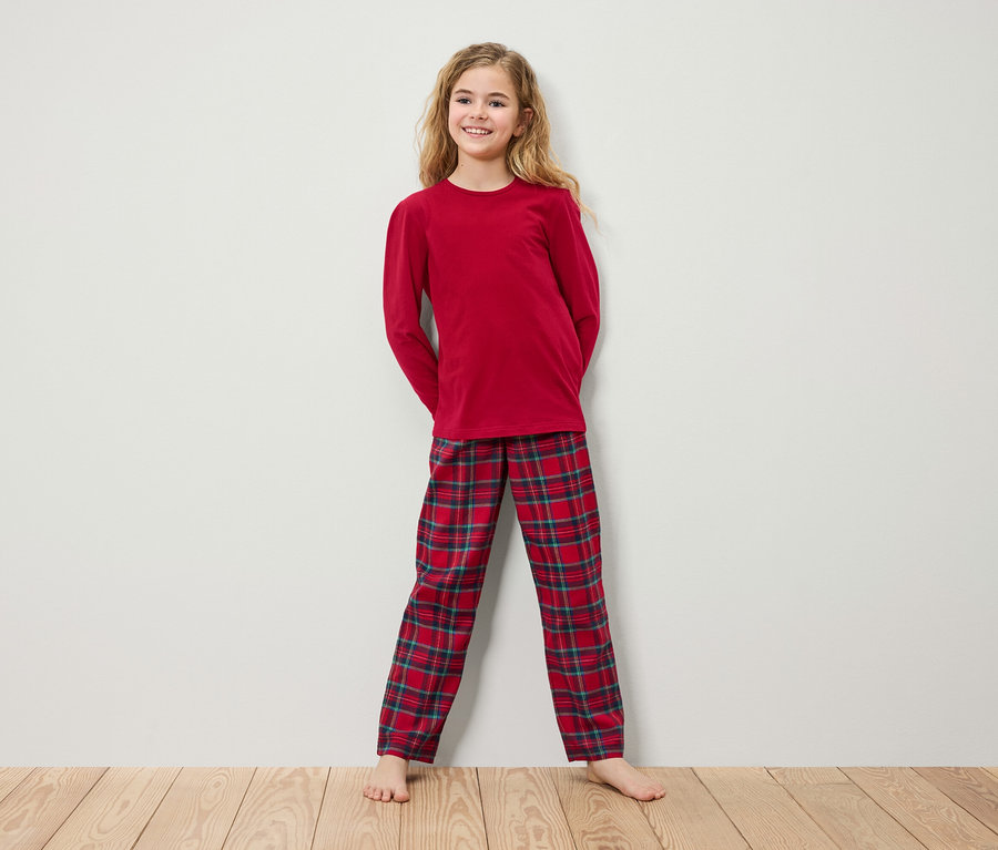 - Spodnie: czerwone z wielokolorowym wzorem w kratę