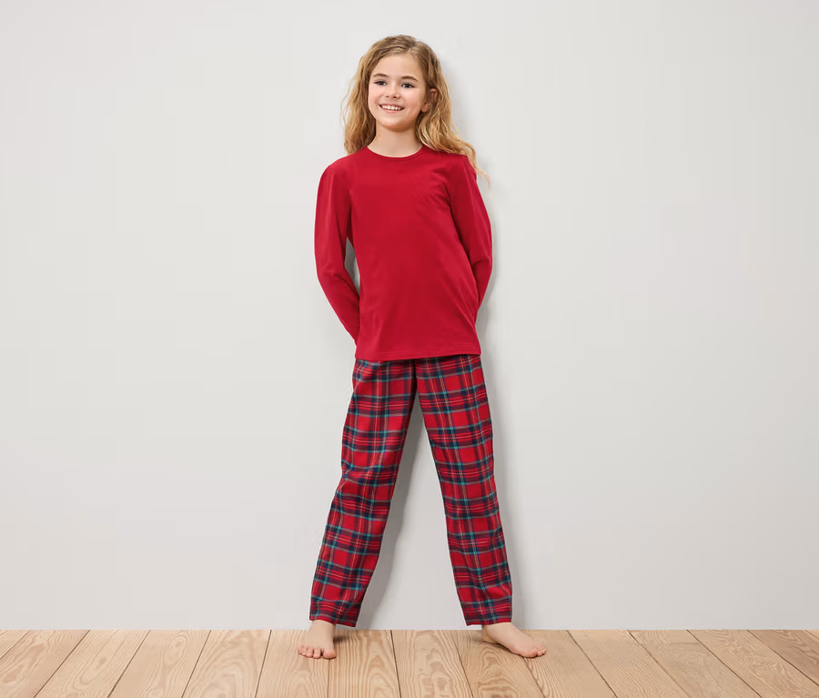 - Spodnie: czerwone z wielokolorowym wzorem w kratę