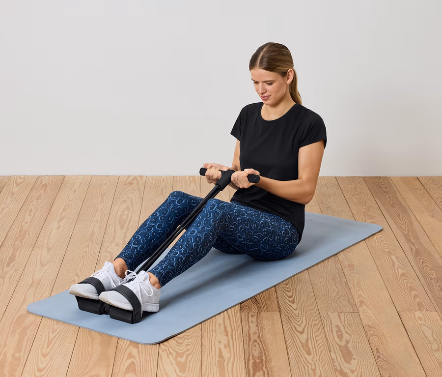 - Składa się z czterech taśm oporowych, dwóch antypoślizgowych uchwytów z pianki i dwóch uchwytów na stopy