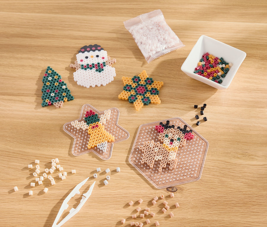 W zestawie 2000 koralików do prasowania w 8 różnych kolorach (po 250 sztuk), pęseta, sześciokątna płytka do układania, płytka do układania w kształcie gwiazdy, szablon z motywami w formacie A4 oraz instrukcja wykonania