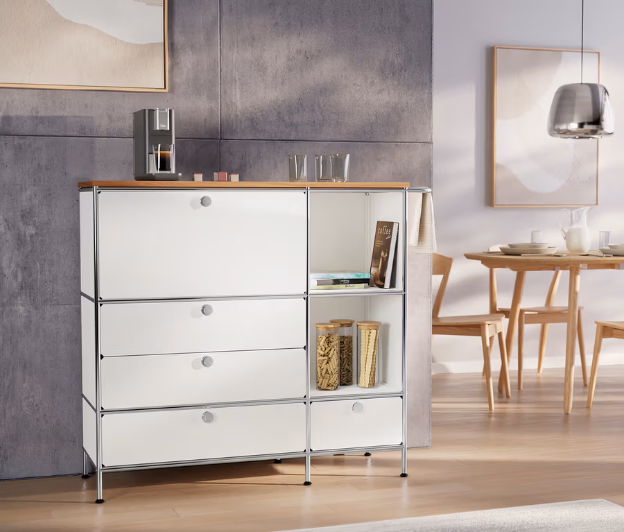Komoda metalowa „CN3” z drewnianym blatem, 1 klapą i 4 szufladami, biała