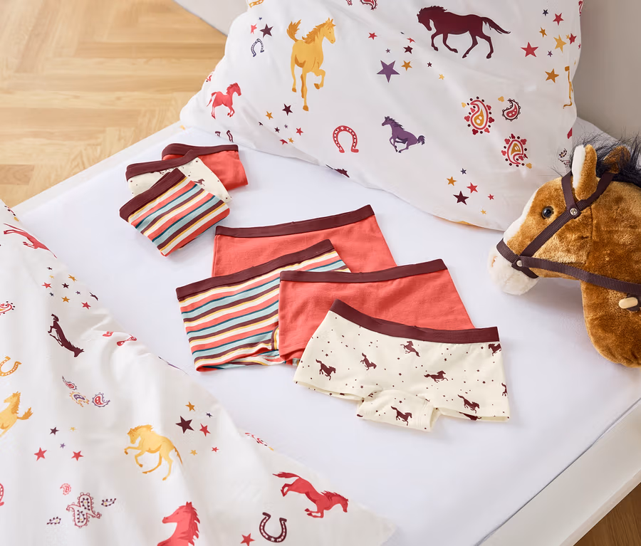 - 2x w wielokolorowe paski, 3x jasnoczerwone, 2x kremowe z bordowym nadrukiem koni na całej powierzchni
