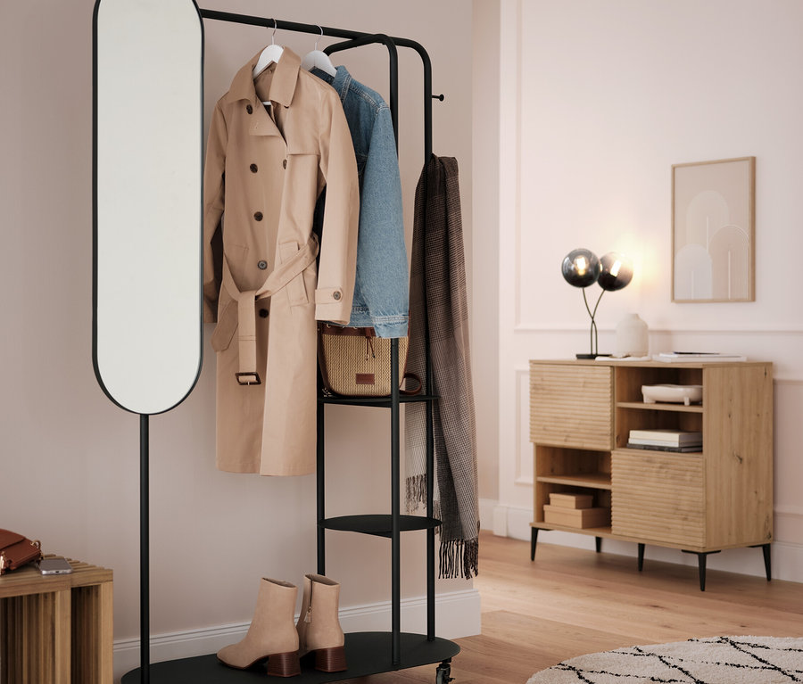 - Lustro w metalowej ramie, drążek na ubrania ze stoperami, 2 haczyki, 2 okrągłe półki, 4 kółka
