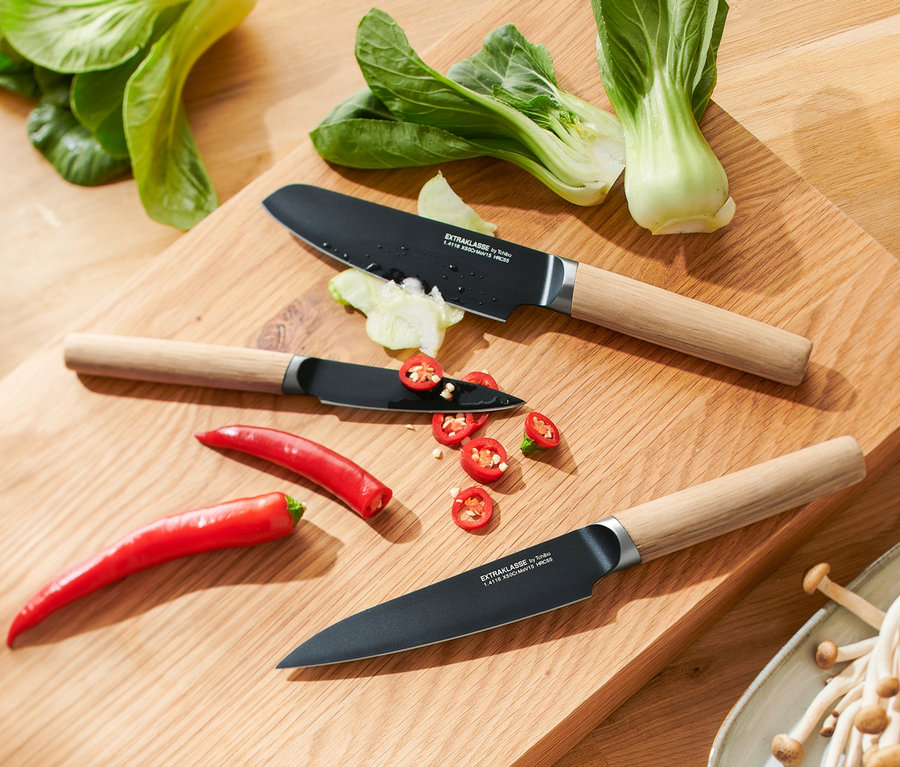 • Odpowiedni nóż do każdego celu: nóż kuchenny, nóż do owoców i warzyw oraz nóż uniwersalny