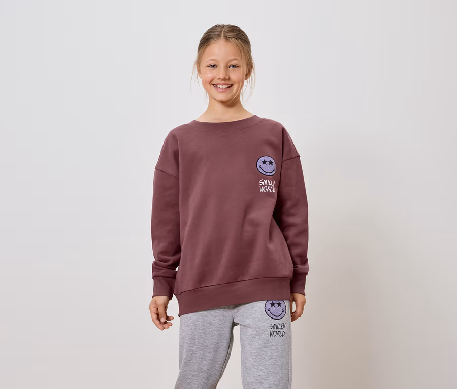 - Jagodowa z fioletowo-białą aplikacją Smiley z przodu, wielokolorowe nadruki Smiley z tyłu