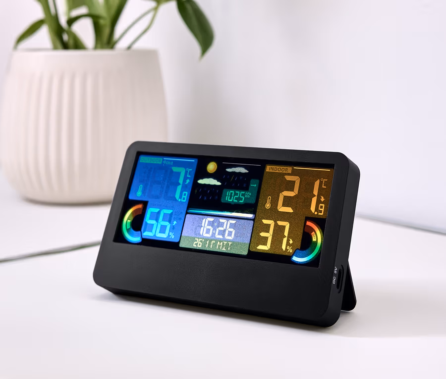 - Wyświetla temperaturę, wilgotność powietrza i trend pogody