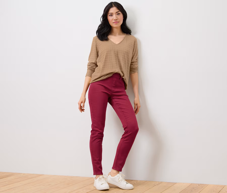 • Dopasowany krój | wąskie nogawki | średni stan | długość do kostki