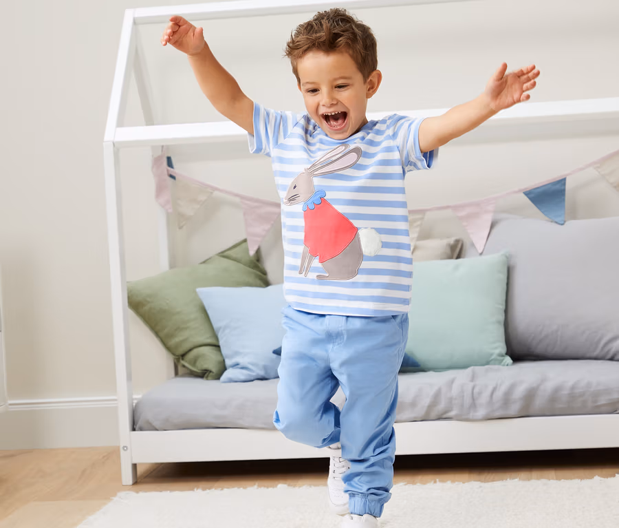 - Jedna koszulka z kieszonką na piersi i małą aplikacją zajączka, jedna koszulka z dużym nadrukiem zająca