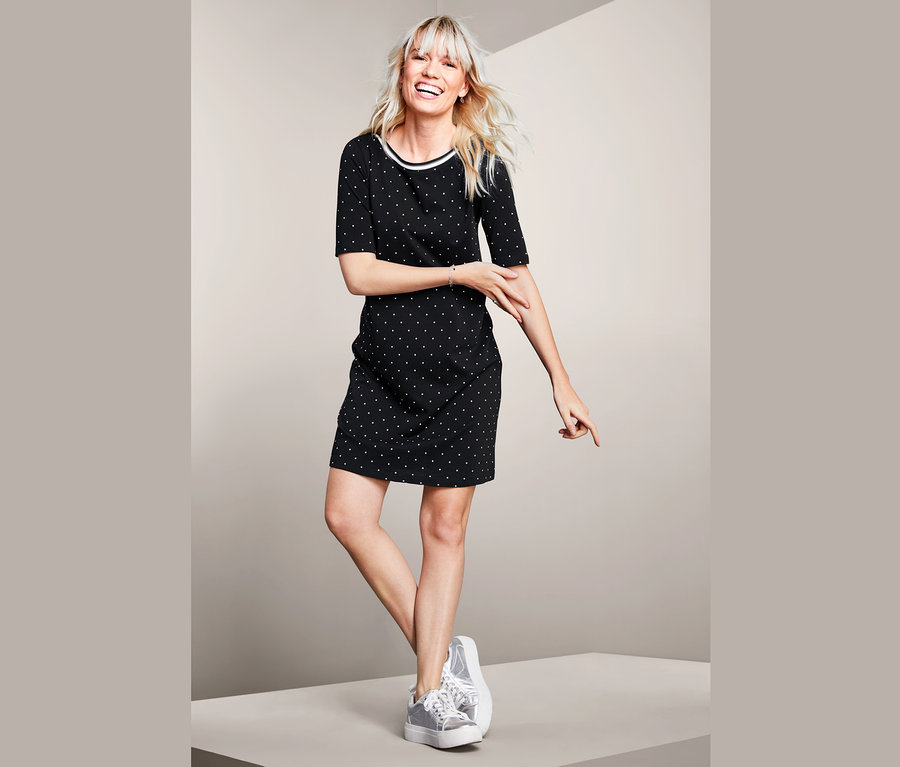 Sukienka we wzór w kropki to ponadczasowa klasyka, zawsze modna. Sukienka z dżerseju w klasycznym, czarnym kolorze zyskuje na lekkości dzięki swoim białym kropkom. Dzięki temu pasuje na prawie każdą okazję. Bawełna ekologiczna, z której jest wykonana, sprawia, że jest wyjątkowo miękka w dotyku i wygodna w noszeniu.