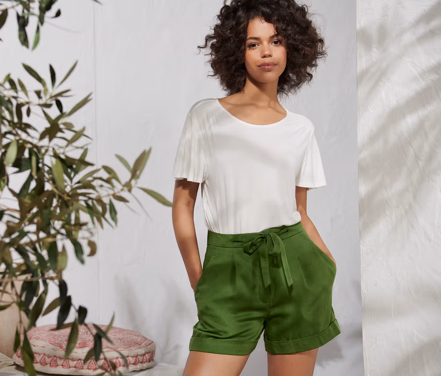 - Te szorty zawierają włókna ze zrównoważonego drewna.