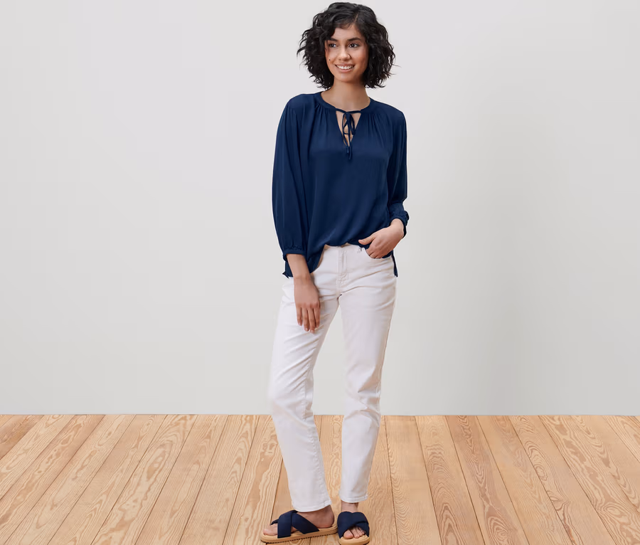 - Dekolt tunikowy z delikatnym marszczeniem i troczkami