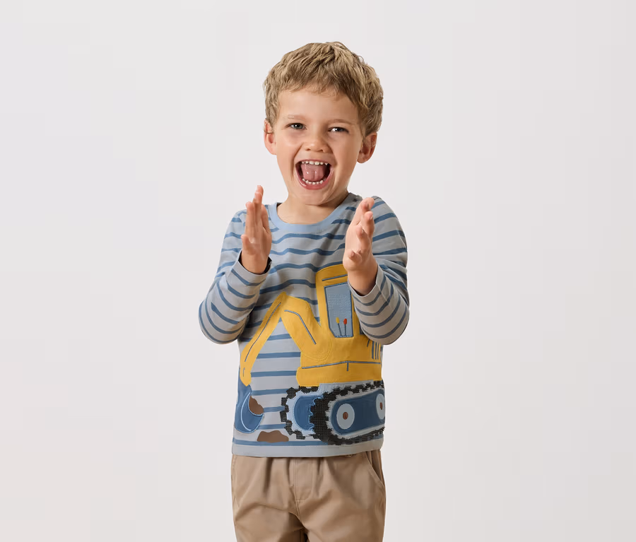 - 1x jasnoniebieska z niebieskimi paskami i wielokolorową aplikacją koparki