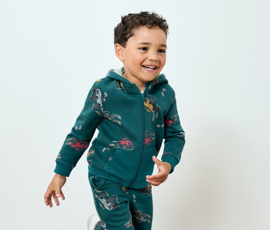 Ciemnozielona z wielobarwnym nadrukiem monster trucków na całej powierzchni