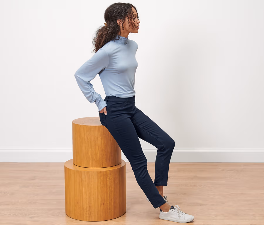- Dopasowany krój | wąskie nogawki | średni stan | długość do kostki