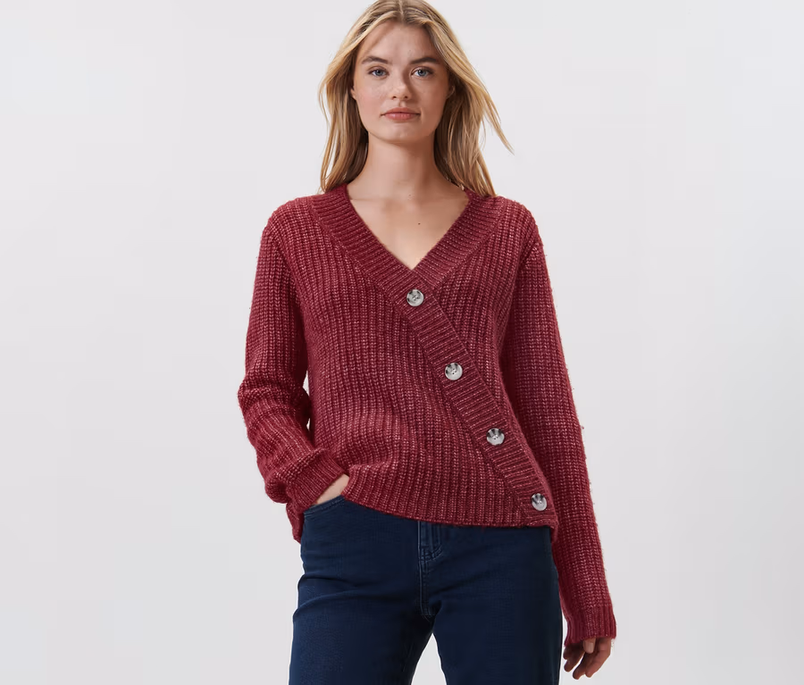 • Rozpinany sweter z asymetryczną plisą z guzikami