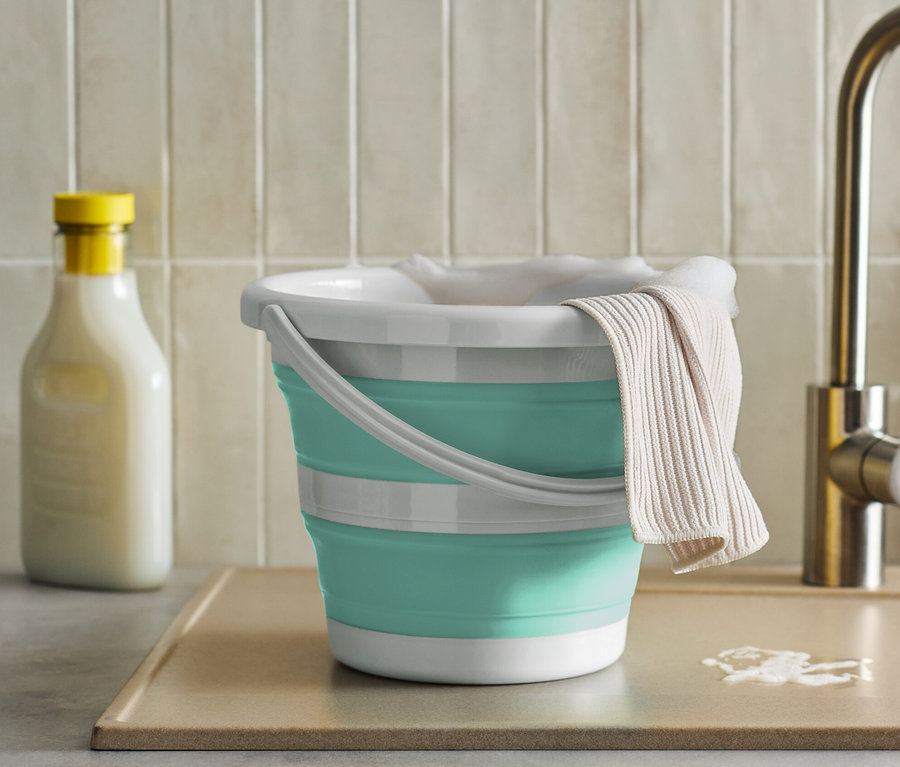 - Z oczkiem do zawieszenia – złożone na płasko wiadro można przechowywać zawieszone na ścianie