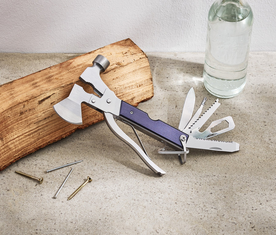 - 11 funkcji: siekiera, młotek, nóż o gładkim ostrzu, szczypce, pilnik, piła do drewna, piła zwykła, śrubokręt krzyżakowy, śrubokręt płaski, klucz do śrub (6, 7, 8, 10 mm) i otwieracz do butelek