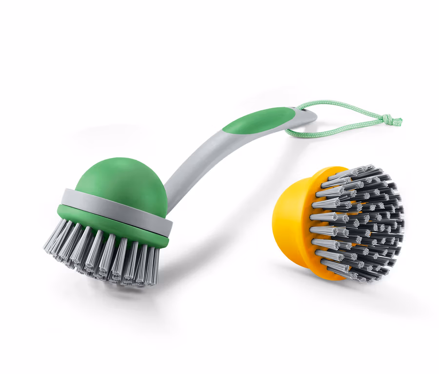 Odpowiednie przygotowanie do zmywania jest prawie tak pomocne, jak skuteczne wsparcie podczas samego zmywania. Tej szczotki do zmywania można używać zarówno jako klasycznej szczotki do zmywania naczyń, jak również - bez uchwytu - jako szczotki do czyszczenia intensywnie zabrudzonych garnków i patelni. Końcówki są wymienne i w razie potrzeby można szybko jedną zastąpić drugą. Zestaw zawiera dwie końcówki w różnych kolorach. Takie rozwiązanie zapewnia wyjątkowo higieniczne zmywanie różnego rodzaju naczyń.