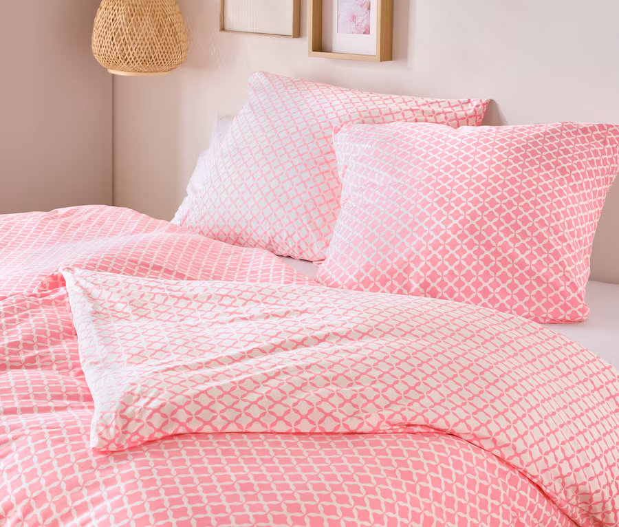 - Jedna strona różowa z geometrycznym nadrukiem na całej powierzchni w kolorze złamanej bieli